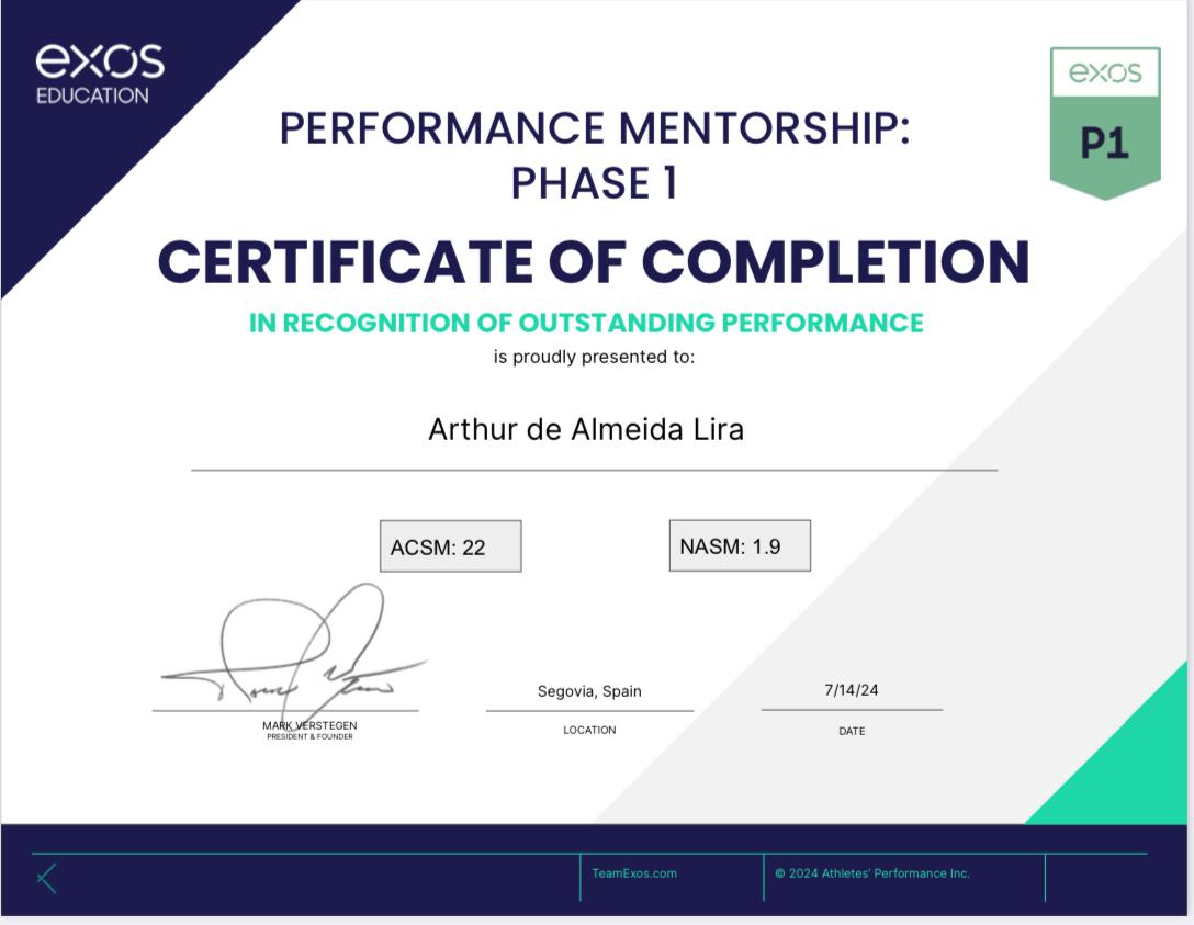 Formación completada en EXOS Performance Mentorship – Phase 1, un referente mundial en la preparación y readaptación de deportistas de élite.
